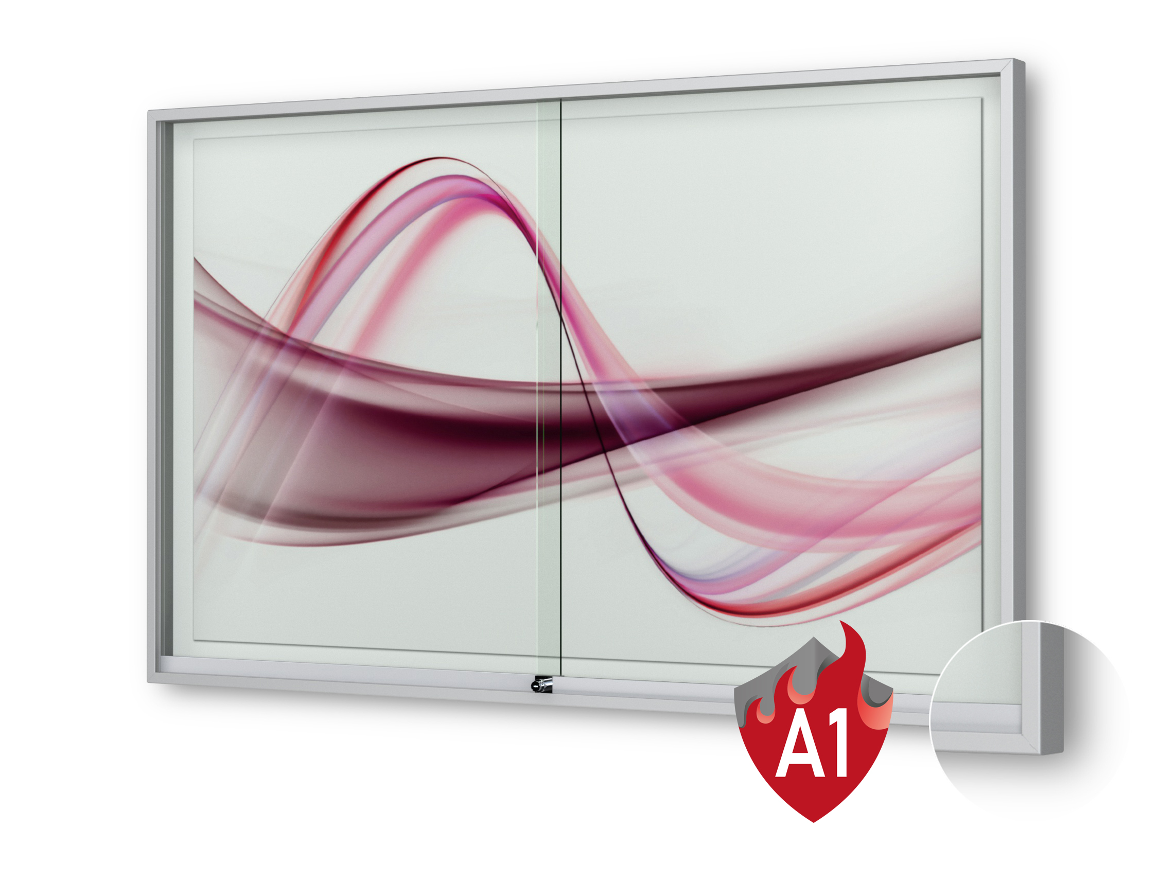 Plakatvitrine: | Brandschutz, Montageort: Innen, Wandmontage, abschliessbar, mit Schiebetüren |
