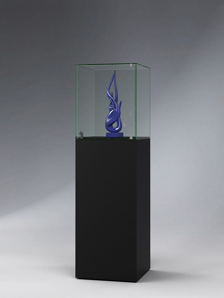 Haubenvitrine Exponat "SIGNUM |  ITALIEN SKY" - Design-Vitrine Das Modell SIGNUM | ITALIAN SKY gehört zu unseren Ganzglas-Ausstellungsvitrinen designed by Ute Bröker. In der eleganten Haubenvitrine fühlt sich ein hochwertiges Einzelexponat besonders wohl. Losgelöst von anderen Ausstellungsstücken und auf Augenhöhe des Betrachters positioniert, kann es ungehindert von allen Seiten betrachtet werden. ITALIAN SKY bietet sich für die Fälle an, in denen ein einzelnes Objekt frei im Raum in Szene gesetzt werden soll. Design-Haubenvitrine in Ganzglas-Bauweise mit farbig hinterdruckten Glasflächen ESG-Sicherheitsglas für alle außen liegenden Glasflächen Schwarze Glas-Fußplatte mit eleganten Aluminiumfüßen Logoeindruck auf Anfrage Höhe des Ausstellungsteils: 565 mmGlas-Fußplatte B x T: 620 x 420 mm, mit eleganten Aluminium-FüßenÖffnung: Seitliche Drehtür mit Sicherheitsschloss untenVerglasung: ESG-Sicherheitsglas bei allen außenliegenden GlasflächenGlasfachboden: 1 Glasfachböden im Ausstellungsteil und 1 Glasfachboden im Unterschrankaus ESG-Sicherheitsglas, fest verklebt - max.Belastung ca. 10kg je Fachboden bei gleichmäßiger LastverteilungFarbe/Oberfläche: Hinterdruckte Farbflächen wahlweise in schwarz, grau  - optional in RAL-FarbtönenVerschlusstechnik: 1 Sicherheitsschloss mit 2 Schlüsseln