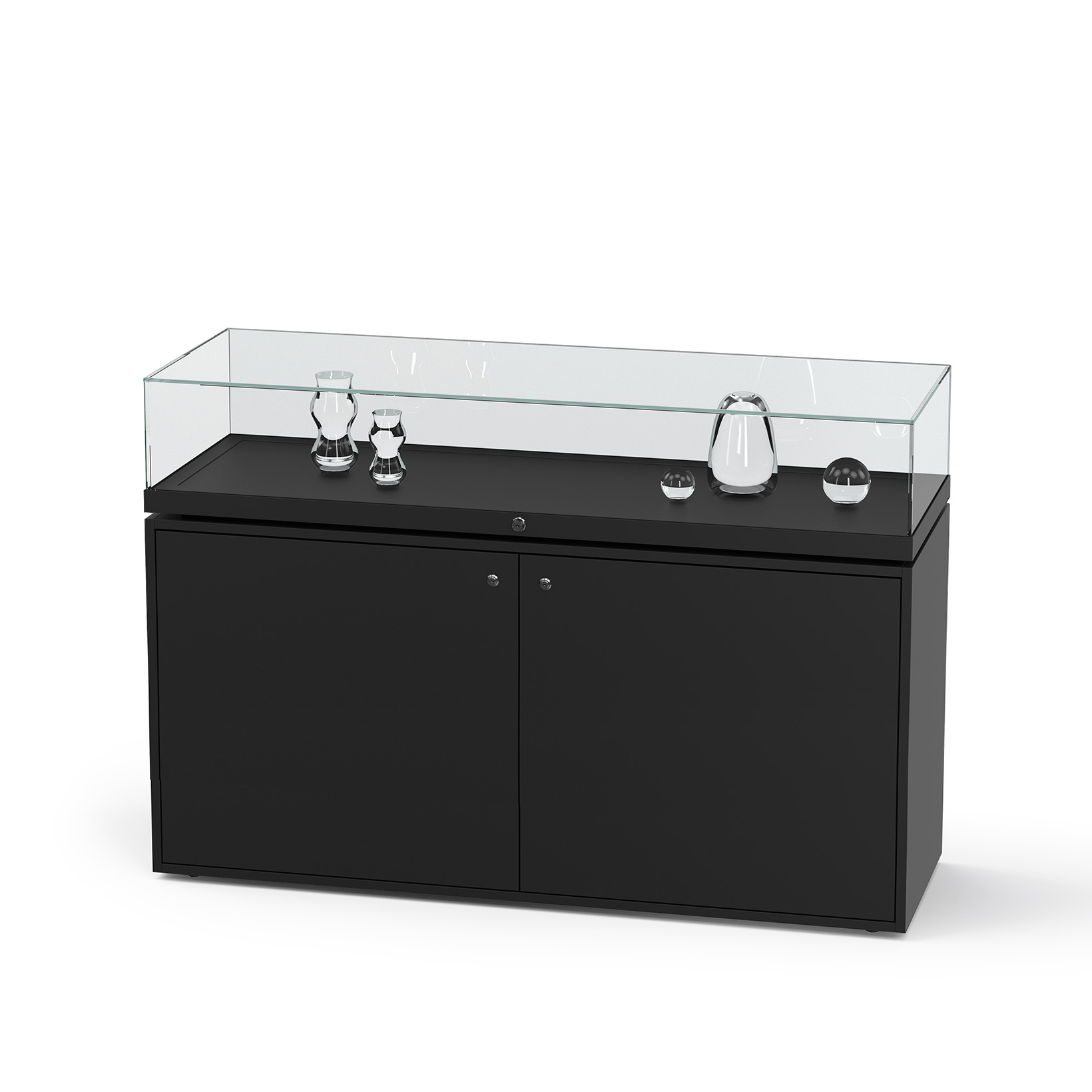 Tischvitrine Glas mit abschließbarem Unterschrank Rahmenlose Ganzglas-Konstruktion mit 8mm ESG-SicherheitsglasUnsere Stauraum-VitrineDesign-Vitrine für Museen, Ausstellungen oder das exklusive Büro Unterschrank aus beschichteter Holzplatte Größen B/H/T1000 × 970 × 500 mm1200 × 970 × 500 mm1400 × 970 × 500 mmHöhe des Glaskorpus 220 mmÖffnung - Glaskorpus aufklappbar mit seitlichen Gasdrucköffnern, die den Aufbau arretierenVerglasung - Einscheiben-Sicherheitsglas / ESGOberfläche – schwarz - optional: weiß oder hellgrauBeleuchtung - ohne Beleuchtung - optional: waagerechte Stahlerschiene mit LED-Strahlern, inkl. TrafoSchließung - Sicherheitsschlößer mit je 2 Schlüsseln