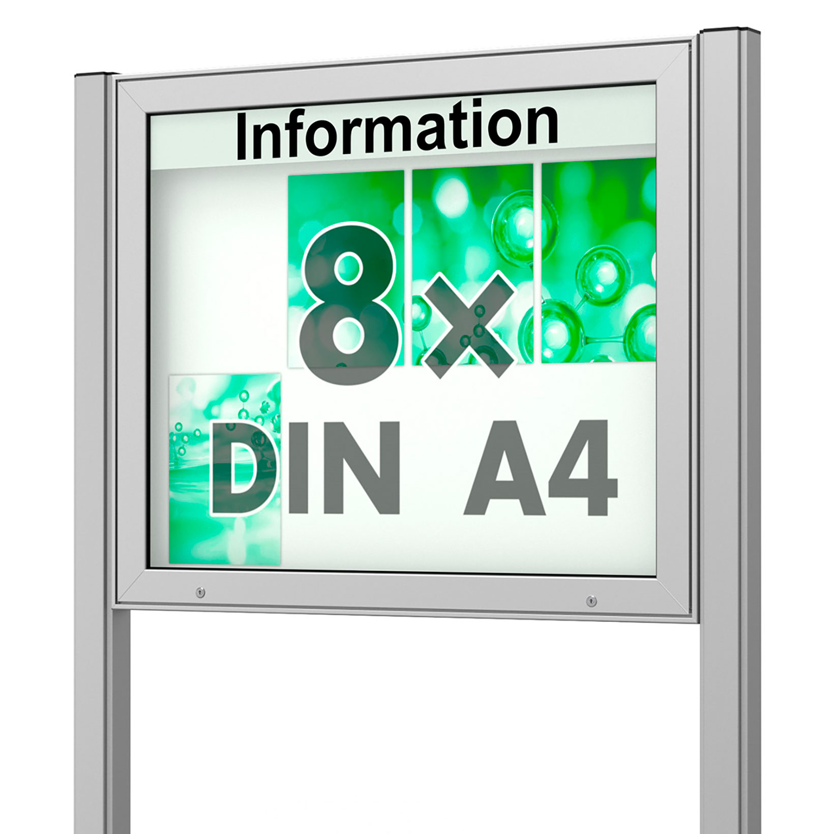 8 x DIN A4 Schaukasten Plenum eckig - der "Klassiker" mit Solar-Modul und Pfosten - Bautiefe 65mm